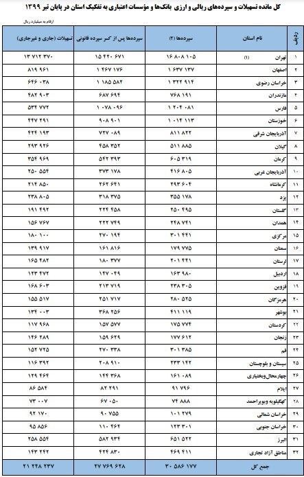 مانده کل تسهیلات بالغ بر 21248.2 هزار میلیارد ریال است که نسبت به مقطع مشابه سال قبل 5139.3 هزار میلیارد ریال (31.9 درصد) و نسبت به پایان سال قبل 1892.4 هزار میلیارد ریال (9.8 درصد) افزایش داشته است. بیشترین مبلغ تسهیلات مربوط به استان تهران با مانده 13712.4 هزار میلیارد ریال و کمترین مبلغ مربوط به استان کهگیلویه و بویر احمد معادل 73 هزار میلیارد ریال است.