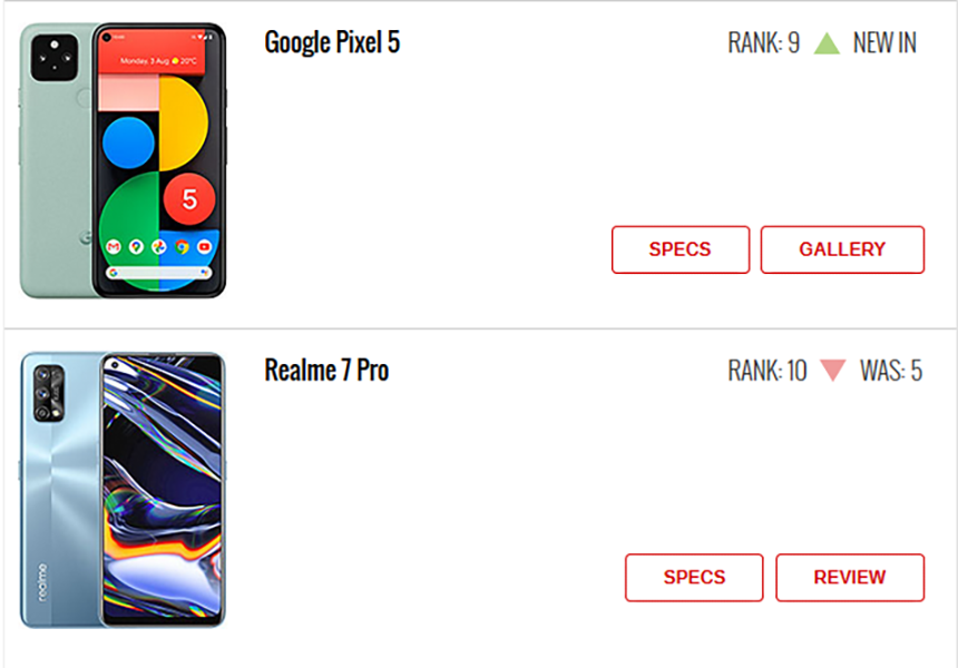 گوگل Pixel ۵ در این هفته در چندین نشست معرفی شد که این باعث شد رتبه نهم جدول پرطرفدارترین گوشیها را از آن خود کند. اپل Realme ۷ Pro که هفته پیش پنجم بود، این ردهبندی را کامل میکند و در جایگاه دهم قرار میگیرد.