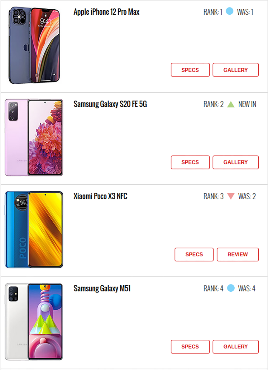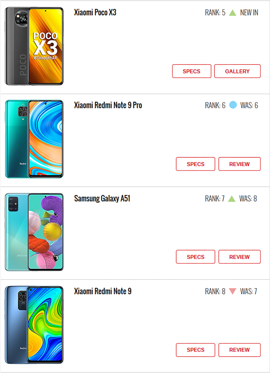 سامسونگ Galaxy M۵۱ که هفته پیش جایگاه چهارم را در اختیار داشت این هفته نیز رتبه خود را حفظ کرد، در حالی که شیائومی Poco X۳ (نسخه غیر NFC) که به تازگی معرفی شده، در رتبه پنجم قرار گرفته است.