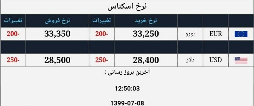 قیمت یورو نیز برای فروش در صرافی ملی 33350 تومان اعلام شده است؛ قیمت خرید یورو نیز در این صرافیها 33250 تومان است.