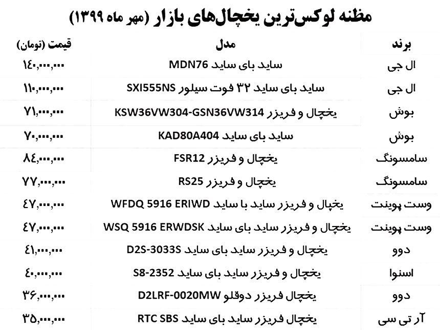 آنچه در زیر میآید قیمت لوکسترین یخچالهای بازار در سطح بازار تهران (ابتدای پاییز ۹۹) است.
