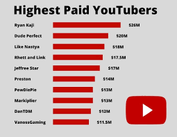 برخی از برترین یوتیوب ها برای هر ویدیو مبلغ سرسام آوری دریافت می کنند. رایان 8 ساله با کانال خود به اسم " دنیای رایان" درآمد خود را از 26 میلیون دلار تخمین زده است کانال محبوب دیگری به نام Dude Perfect که پنج دوست دبیرستانی هستند که حرکات جذاب را به نمایش میگذارند ، 20 میلیون دلار درآمد دارد. گفته می شود PewDiePie گرچه هنوز هم از محبوبیت بالایی برخوردار است ، اخیراً افت درآمد YouTube خود را 15.5 میلیون اعلام کرده است.