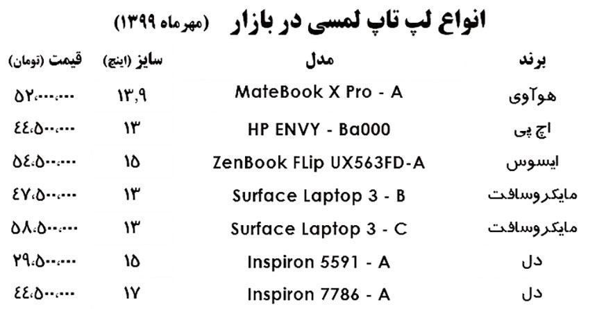 آنچه در زیر می آید قیمت انواع لپ تاپ لمسی در سطح بازار تهران است.
