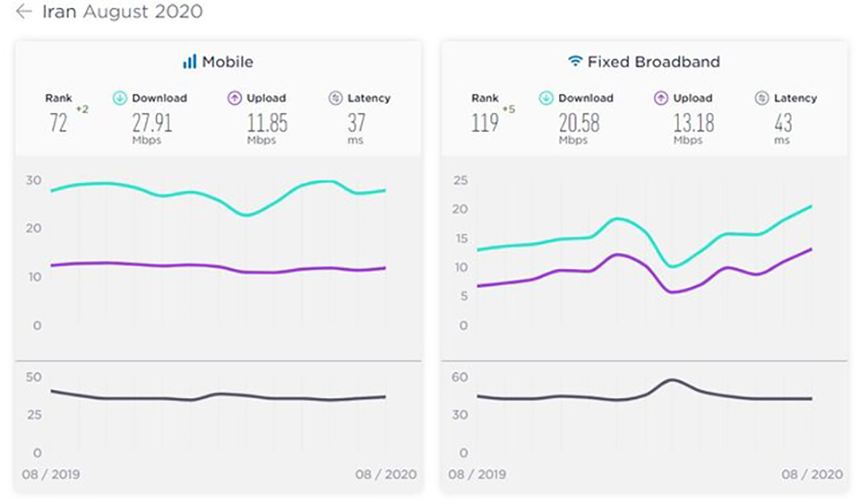 این در حالی است که در ماه جولای، در حوزه اینترنت ثابت، متوسط سرعت دانلود در ایران، ۱۸.۱۴ مگابیتبرثانیه و متوسط سرعت آپلود ۱۰.۹۸ مگابیتبرثانیه بود. همچنین طبق این آمار، اینترنت موبایل ایران در حال حاضر از جمهوری کیپ ورد و میانمار کندتر و از صحرای غربی و توگو سریعتر است.
