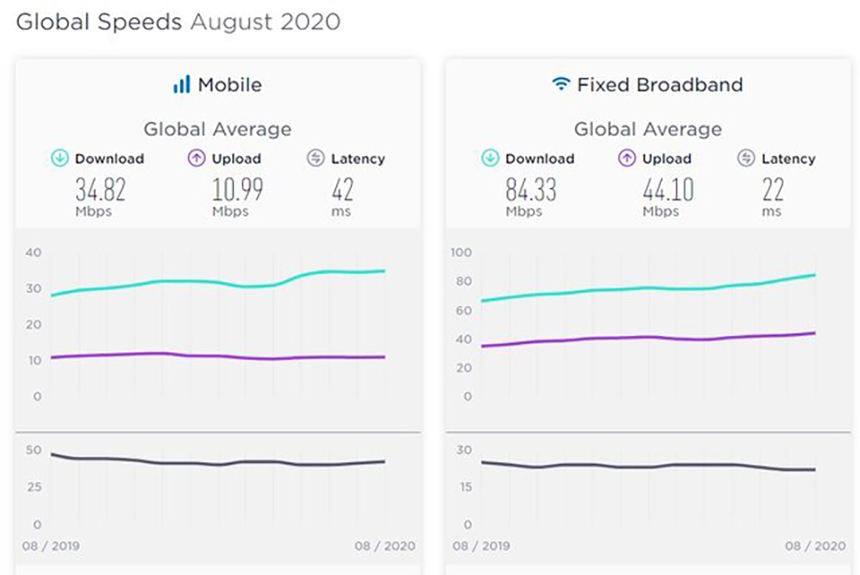 در حال حاضر و طبق آخرین آمار منتشرشده تا ماه آگوست ۲۰۲۰، متوسط جهانی سرعت دانلود اینترنت موبایل، ۳۴.۸۲ مگابیتبرثانیه و متوسط جهانی سرعت آپلود اینترنت موبایل، ۱۰.۹۹ مگابیتبرثانیه و تاخیر، ۴۲ میلیثانیه است. است. همچنین در حوزه اینترنت ثابت، متوسط جهانی سرعت دانلود، ۸۴.۳۳ مگابیتبرثانیه و متوسط جهانی سرعت آپلود ۴۴.۱۰ مگابیتبرثانیه و تاخیر، ۲۲ میلیثانیه است.