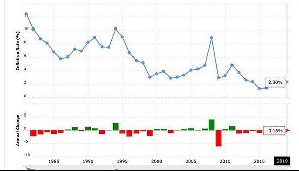 نمودار آبى رنگ متوسط نرخ تورم جهان را از سال 1980 تاکنون نشان مىدهد. همانطور که مشاهده مىشود، روند کلى نزولى است. بعد از بحران 2008 و سیاستهاى به شدت انبساطى بانکهاى مرکزى این نگرانى وجود داشت که تورم افزایش یابد اما چنین نشد و بعد از افزایشى مختصر مجددا نزولى شد.