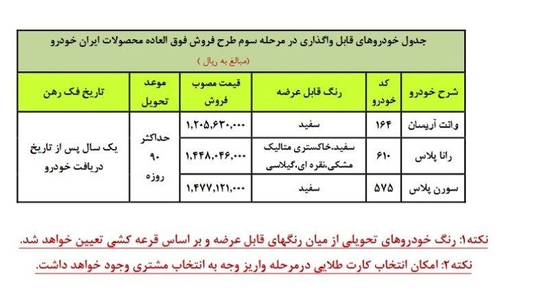 در این برنامه فروش، مشتریان هیچ گونه وجهی به عنوان پیش پرداخت واریز نخواهند کرد، منتخبان نیز به مدت پنج روز مهلت خواهند داشت تا نسبت به واریز وجه کامل خودرو اقدام کنند.