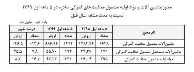 جدیدترین آمار منتشر شده از سوی وزارت صمت نشان می‌دهد که در پنج ماهه اول امسال ۱۴۲۴ فقره مجوز برای ماشین آلات و ۱۹۳ ماشین آلات مستعمل مشمول معافیت گمرکی به ارزش ۶۸۶ میلیون و ۹۲۰ دلار و ۵۵ میلیون و ۷۰۰ دلار صادر شده که به ترتیب نسبت به مدت مشابه سال قبل به لحاظ تعداد ۱۳.۶ درصد کاهش و ۷.۸ درصد افزایش داشته است. یعنی در پنج ماهه اول پارسال به ترتیب ۱۶۴۸ فقره مجوز برای ماشین آلات و ۱۷۹ ماشین آلات مستعمل مشمول معافیت گمرکی صادر شده است.