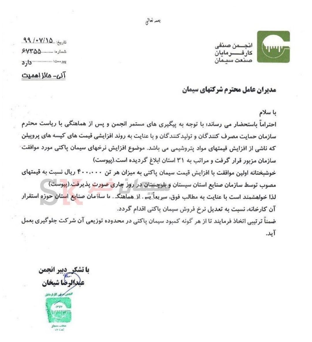 در این اطلاعیه درباره افزایش قیمت سیمان آمده است: