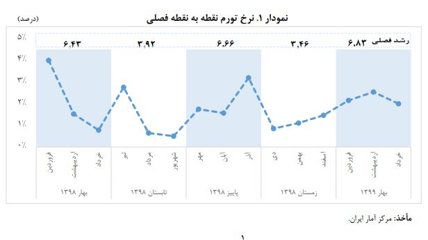 تغییرات نرخ تورم در بهار ۱۳۹۹ شاخص قیمت مصرف کننده با ۶.۸۳ درصد افزایش در بهار ۱۳۹۹ نسبت به پایان سال ۱۳۹۸، بالاترین میانگین نرخ رشد شاخص قیمت مصرف کننده در طول چهار فصل گذشته را ثبت کرد.