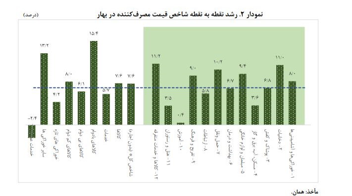 بالا رفتن نرخ رشد نقدینگی و پایه پولی در کنار سایر عوامل باعث افزایش انتظارات تورمی شده و از این رو نقدینگی افزایش یافته به سمت بازار دارایی ها و بازار کالاهای بادوام رفته است. کالاهای بادوام با ۱۵.۴۳ درصد، بیشترین رشد را در بین گروه های کالایی در بهار داشته اند.