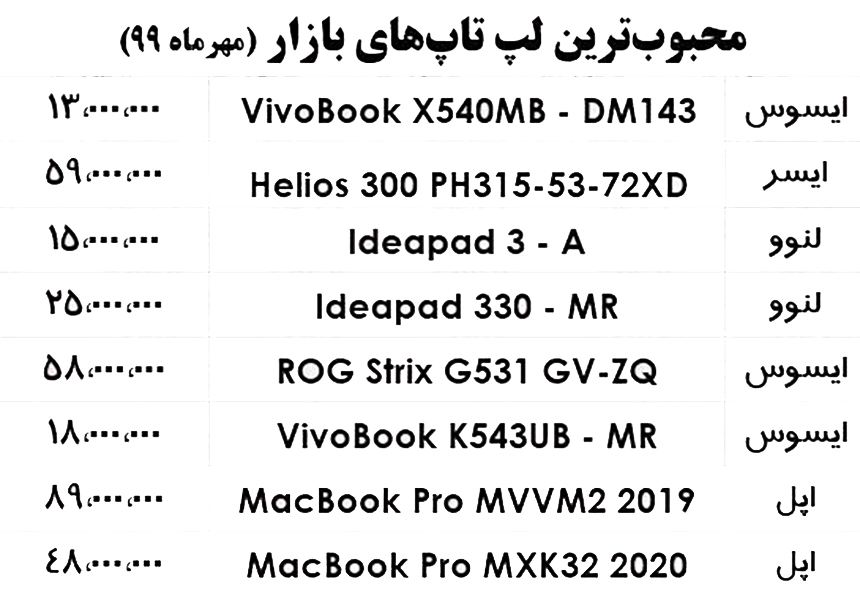 شما می توانید قیمت محبوبترین لپ تاپ های و جود در بازار را در جدول زیر بخوانید.