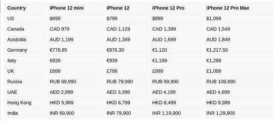 قیمت ایالات متحده در مدل های آیفون 12 ذکر شده در بالا برای مدل های قفل نشده است. قیمت مدل های AT&T و Verizon iPhone 12 و iPhone 2 mini سی دلار کمتر است. قیمت نهایی در کشورهای مختلف ممکن است براساس مالیات و بازپرداخت های قابل اعمال محلی متفاوت باشد.