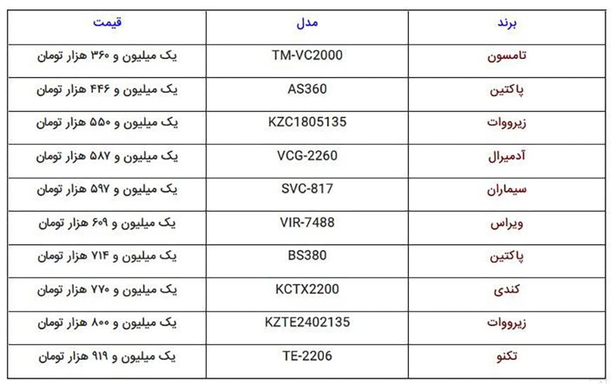 ۱۰ جاروبرقی ارزان قیمت موجود در بازار لوازم خانگی با قیمتی کمتر از دو میلیون تومان قابل خریداری هستند.با بودجه ۸ میلیون تومان میتوان اقدام به خرید یخچال فریزر کنید
