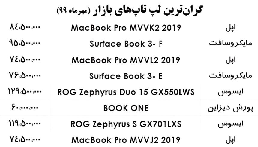 در جدول زیر قیمت گرانترین لپ تاپهای بازار را برای شما گرد اوری کرده ایم.