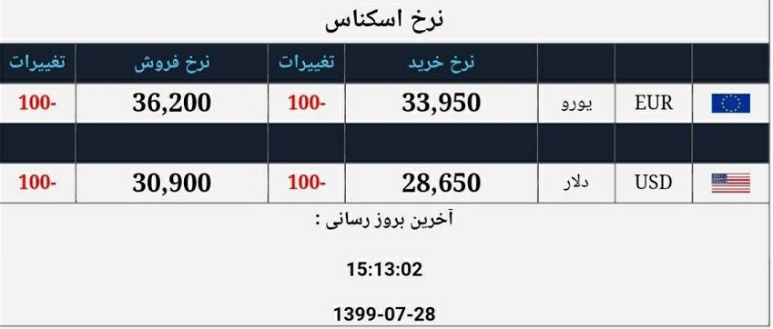 همچنین هر فرانک سوئیس ۴۵ هزار و ۸۶۸ ریال، کرون سوئد ۴ هزار و ۷۴۸ ریال، کرون نروژ ۴ هزار و ۴۸۱ ریال، کرون دانمارک ۶ هزار و ۶۰۷ ریال، روپیه هند ۵۷۳ ریال، درهم امارات متحده عربی ۱۱ هزار و ۴۳۷ ریال، دینار کویت ۱۳۷ هزار و ۲۱۵ ریال، یکصد روپیه پاکستان ۲۵ هزار و ۸۵۹ ریال، یکصد ین ژاپن ۳۹ هزار و ۸۳۶ ریال، دلار هنگ کنگ ۵ هزار و ۴۲۰ ریال، ریال عمان ۱۰۹ هزار و ۲۳۱ ریال و دلار کانادا ۳۱ هزار و ۸۴۴ ریال قیمت خورد.