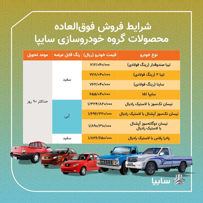گفتنی است؛ در این طرح فروش، ۸ مدل از محصولات گروه خودروسازی سایپا شامل تیباصندوقدار، تیبا۲ و ساینا با رینگ فولادی، سایپا ۱۵۱، دو مدل نیسان تکسوز، نیسان دوگانهسوز و پادرا پلاس با لاستیک رادیال عرضه میشود. حداکثر موعد تحویل این خودروها تا ۹۰ روز آینده خواهد بود.