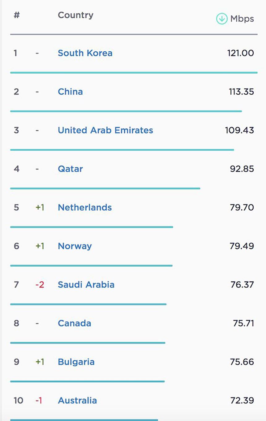 در ردههای سوم، چهارم، پنجم و ششم به ترتیب امارات متحده عربی (با سرعت ۱۰۹ مگابیت برثانیه)، قطر (با سرعت ۹۲.۸۵ مگابیت برثانیه)، هلند (با سرعت ۷۹.۷۰ مگابیت برثانیه) و نروژ (با سرعت ۷۹.۴۹ مگابیت برثانیه) قرار دارند.