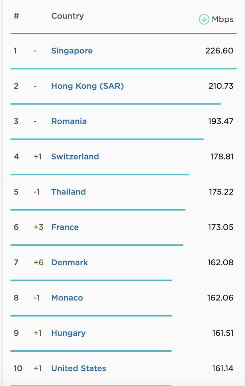 در رده بندی متوسط سرعت اینترنت ثابت کشورهای جهان در سپتامبر ۲۰۲۰، رتبههای یک تا سه مانند ماه گذشته به سنگاپور، هنگ کنگ و رومانی تعلق دارد. در این فهرست سنگاپور با ارائه اینترنت ثابت با متوسط سرعت ۲۲۶.۶۰ مگابیت برثانیه در رتبه نخست قرار دارد. پس از آن هنگ کنگ (با متوسط سرعت ۲۱۰.۷۳ مگابیت برثانیه) و رومانی (با سرعت ۱۹۳.۴۷ مگابیت برثانیه) به ترتیب در رتبههای دوم و سوم قرار دارند.