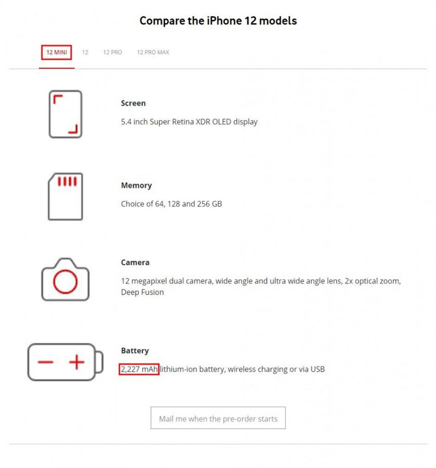 ظرفیت سایر اعضای خانواده آیفون ۱۲ نیز از طریق وب سایت Vodafone در فضای مجازی پخش شد که اعلام میکرد آیفون ۱۲ و ۱۲ پرو از باتری ۲۸۱۵ میلی آمپر ساعتی و آیفون ۱۲ مینی از باتری ۲۲۲۲ میلی آمپر ساعتی استفاده خواهد کرد. تقریبا تمامی اعضای خانواده آیفون ۱۲ نسبت به سال قبل با کاهش ظرفیت باتری همراه شدند، اما بر اساس ادعای شرکت اپل، ظاهرا چیپست استفاده شده در آنها که A14 Bionic است، مصرف باتری بسیار کمتری نسبت به گذشته دارد و گوشیهای آیفون ۱۲ زمان بیشتری نسبت به آیفون ۱۱ روشن خواهند ماند.