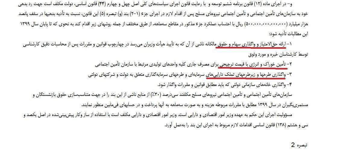 در ضمن بسیاری از اقتصادانان یکی از علل شکست خصوصی سازی در ایران را موضوع واگذاری شرکتهای دولتی بابت تادیه بدهی دولت عنوان می کنند. از این مسیر بسیاری از شرکتهای دولتی در معرض ورشکستگی قرار گرفتند و این تجربه لطمات سنگینی به خصوصی سازی و اصل 44 که می‌توانست زمینه توسعه کشور باشد را فراهم کرد. حالا موضوع واگذاری 9 شرکت به سازمان تامین اجتماعی و نیز ارائه سهام شرکتهای دولتی به صندوق بازنشستگی کشوری بار دیگر بحث واگذاریشرکتها بابت پرداخت بدهیهای دولت به ذهن متبادر می شود که در این خصوص نیز دستگاه های ناظر بایستی حداکثر دقت را لحاظ کنند.