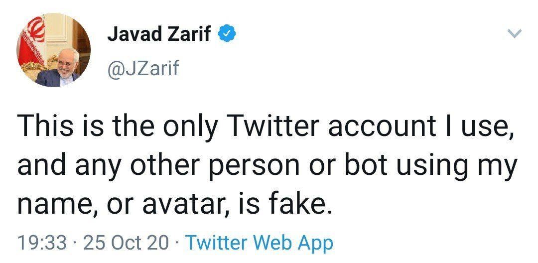 به گزارش سایت طلا به نقل ازایسنا،محمدجواد ظریف وزیر امور خارجه کشورمان در صفحه توییترش نوشت: این تنها حساب توییتری است که از آن استفاده می کنم و هر شخص یا ربات دیگری که از نام یا تصویر من استفاده کند جعلی است.