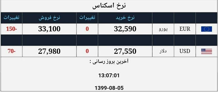 بر اساس این گزارش، هر فرانک سوئیس ۴۶ هزار و ۴۰۹ ریال، کرون سوئد ۴ هزار و ۷۹۲ ریال، کرون نروژ ۴ هزار و ۵۲۹ ریال، کرون دانمارک ۶ هزار و ۶۷۹ ریال، روپیه هند ۵۷۰ ریال، درهم امارات متحده عربی ۱۱ هزار و ۴۳۷ ریال، دینار کویت ۱۳۷ هزار و ۴۴۲ ریال، یکصد روپیه پاکستان ۲۶ هزار و ۱۳ ریال، یکصد ین ژاپن ۴۰ هزار و ۴۴ ریال، دلار هنگ کنگ ۵ هزار و ۴۲۰ ریال، ریال عمان ۱۰۹ هزار و ۲۳۱ ریال و دلار کانادا ۳۱ هزار و ۹۲۴ ریال قیمت خورد.