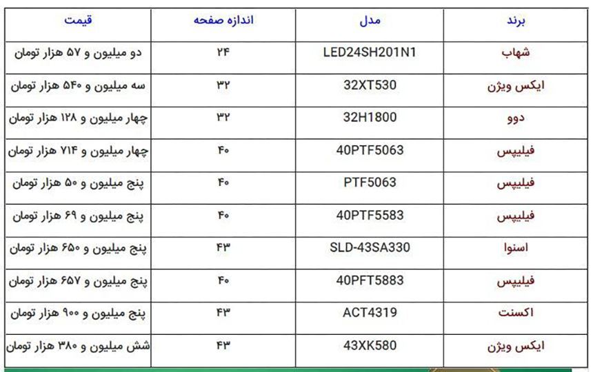 این تلویزیونها محصولات شهاب، ایکس ویژن، دوو، فیلیپس، اسنوا و اکسنت هستند که برندهای شهاب، ایکس ویژن و اسنوا ایرانی محسوب میشوند.