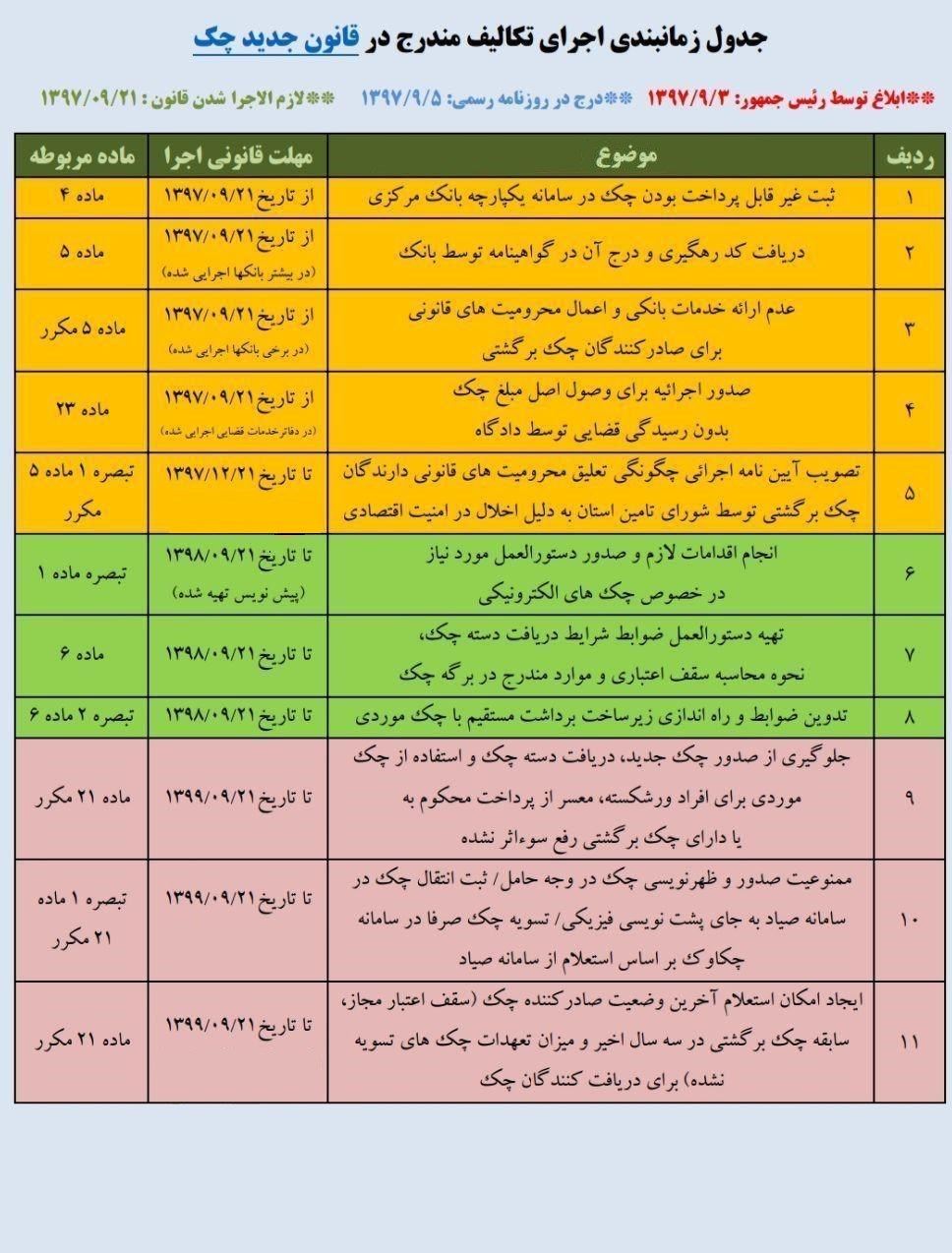براساس زمانبندی اعلام شده، ثبت غیر پرداخت بودن چک در سامانه یکپارچه بانک مرکزی، دریافت کد رهگیری و درج آن در گواهینامه توسط بانک (در بیشتر بانک ها اجرایی شده)، عدم ارائه خدمات بانکی و اعمال محرومیت قانونی برای صادرکنندگان چک برگشتی ( در برخی بانک ها اجرایی شده)، صدور اجرائیه برای وصول اصل مبلغ چک بدون رسیدگی قضایی توسط دادگاه (در دفاتر خدمات قضائی بیشتر اجرایی شده) که از تاریخ 21 آذر 1397 لازم الاجرا است و تصویب آیین نامه اجرائی چگونگی تعلیق محرومیتهای قانونی دارندگان چک برگشتی توسط شورای تامین استان به دلیل اخلال در امنیت اقتصادی که تا تاریخ 21 آذر 1397 لازم الاجرا است.