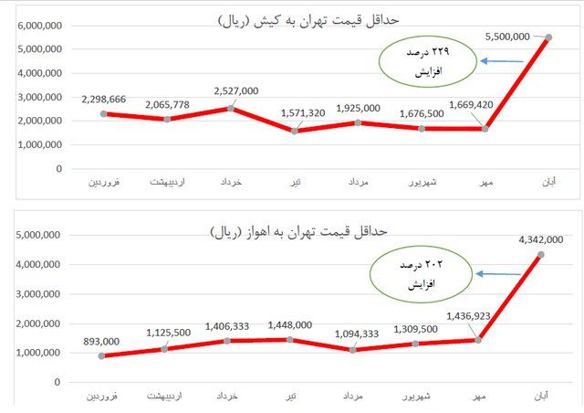 رییس هیاتمدیره انجمن صنفی دفاتر خدمات مسافرت هوایی و جهانگردی در پایان این جلسه به ایسنا گفت: بررسی قیمت بلیت پروازها نشان میدهد از اول آبانماه نرخها از ۱۰۰ تا ۳۰۰ افزایش داشته است. از طرفی آژانسها و ایرلاینها را ملزم کردهاند کف قیمت را رعایت کنند. میگویند نرخنامه سال گذشته را به اجرا گذاشتهاند اما پرسش این است چرا این نرخنامه را یک سال معطل نگه داشتهاند؟ از طرفی انجمن شرکتهای هواپیمایی به لحاظ قانونی وجاهتی برای نرخگذاری ندارد. تعیینکننده نرخ قانون عرضه و تقاضا است. حتی سازمان حمایت مصرفکنندگان و تولیدکنندگان درباره نرخنامهای که شرکتهای هواپیمایی ارائه کردهاند نظر اعتراضی دارد، میگویند محتوای این نرخنامه با آنچه قبلا به این سازمان ارائه شده، مغایر است.