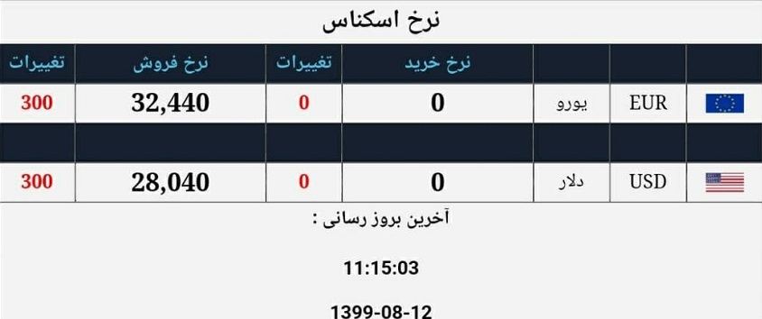 قیمت یورو نیز برای فروش در صرافی ملی 32440 تومان اعلام شده؛ قیمت خرید یورو نیز در این صرافی صفر قیمت خورده است
