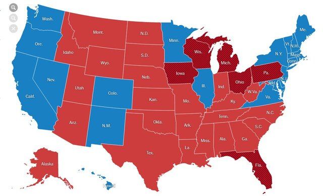 ترامپ: کنتاکی (رای الکترال ۸)، اوکلاهاما (۷)، تنسی (۱۱)، وست ویرجینیا (۵)، آرکانزاس (۶)، میسیسیپی (۶)، آلاباما (۹)، کارولینای جنوبی (۹)، ایندیانا (۱۱)، وایومینگ (۳)، داکوتای جنوبی (۳)، داکوتای شمالی (۳)، لوئیزیانا (۸)، نبراسکا (۴)، کانزاس(۶)، میسوری (۱۰)، آیداهو (۴)، یوتا(۶)، اوهایو (۱۸)، مونتانا (۳)، آیووا (۶)، فلوریدا (۲۹)، تگزاس(۳۸)