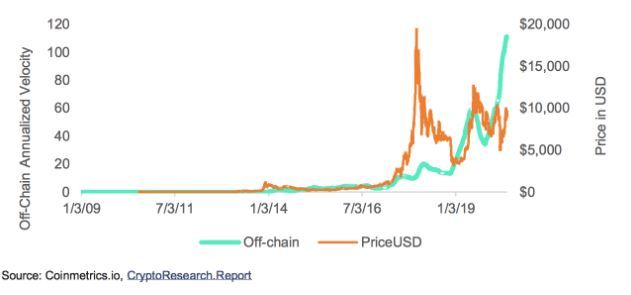 در گزارش تحقیق Crypto آمده است: "اگر ارزهای رمزپایه برای اهداف احتکار طولانی مدت یا هزینه های کوتاه مدت در سوداگری تصویب شوند ، قیمت دارایی های رمزنگاری افزایش می یابد." "سرعت بالای زنجیره ای و سرعت پایین خارج از زنجیره نشان می دهد که دارایی های رمزنگاری به طور فزاینده ای برای سفته بازی و نه برای ذخیره ارزش استفاده می شوند."
