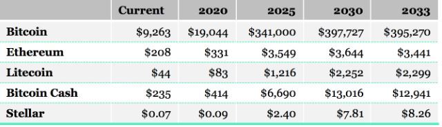 در این گزارش آمده است: "ما معتقدیم كه بیت کوین هنوز در ابتدای منحنی ثابت شدن قیمت خود است." "قیمت 7،200 دلار در پایان سال 2019 نشان می دهد که بیت کوین به کمتر از 0.44٪ از کل بازارهای آدرس پذیر خود (به ارزش 212 تریلیون دلار) نفوذ کرده است. اگر این نفوذ بتواند به 10٪ برسد ، قیمت کم هزینه آن باید به 400،000 $ برسد. "