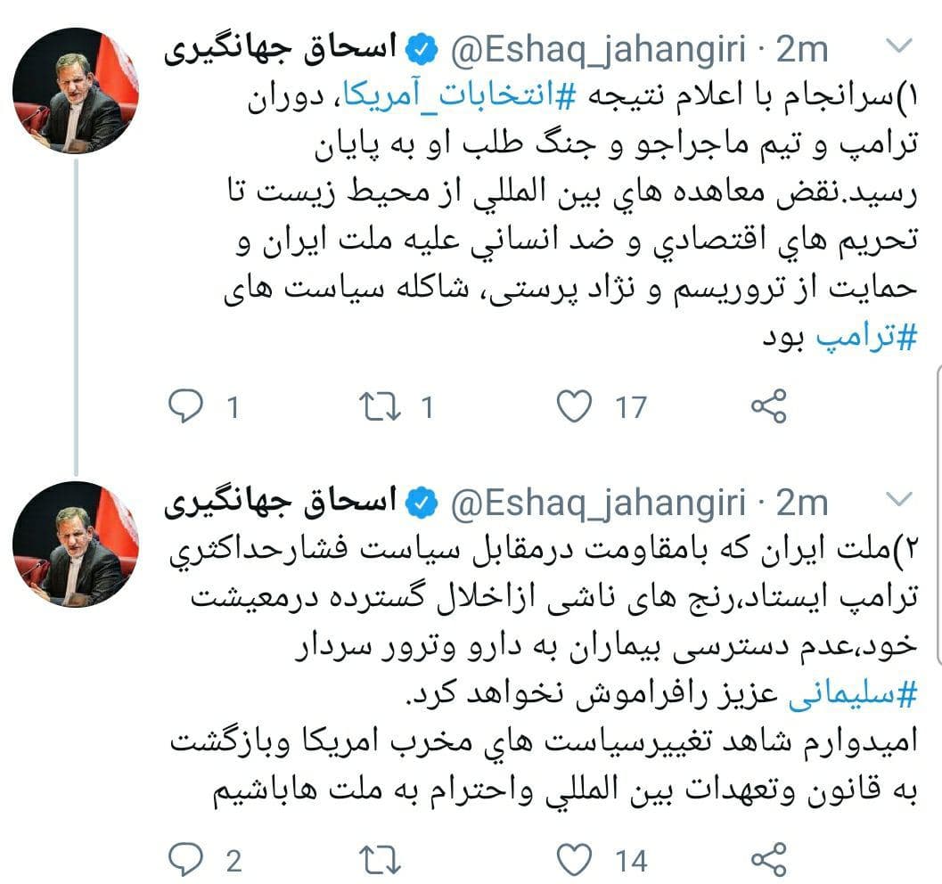 معاون اول رئیس جمهوری اسلامی ایران در توییتر نوشت: سرانجام با اعلام نتیجه انتخابات آمریکا، دوران ترامپ و تیم ماجراجو و جنگ طلب او به پایان رسید.