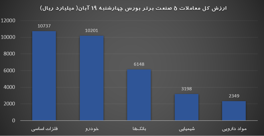 امروز نمادهای پلیمر آریا ساسول (آریا)، صنعتی مینو (غصینو)، توسعه مسیر برق گیلان (بگیلان)، برق و انرژی پیوند گستر پارس (بپیوند)، گروه سرمایه گذاری میراث فرهنگی (سمگا)، بیمه تجارت نو (بنو)، توزیع داروپخش (دتوزیع)، آتیه داده پرداز (اپرداز)،توسعه خدمات دریای و بندری سینا (حسینا)،توکاریل (توریل) و پخش البرز (پخش) با تاثیر مثبت بر شاخص این بازار همراه بودند.
