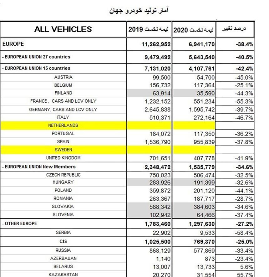 تولید خودرو اروپا در نیمه نخست 2020 بالغ بر 38.4 درصد نسبت به سال قبل کاهش یافته و به 6 میلیون و 941 هزار دستگاه رسیده است. تولید خودرو فرانسه به کمتر از نصف رسیده است. فرانسه که در نیمه نخست سال قبل 1 میلیون و 232 هزار دستگاه خودرو تولید کرده بود در نیمه نخست امسال تنها 551 هزار دستگاه تولید داشته است. تولید آلمان به عنوان بزرگترین خودروساز اروپا نیز با افت 39.7 درصدی مواجه شده و به 1 میلیون و 595 هزار دستگاه رسیده است.