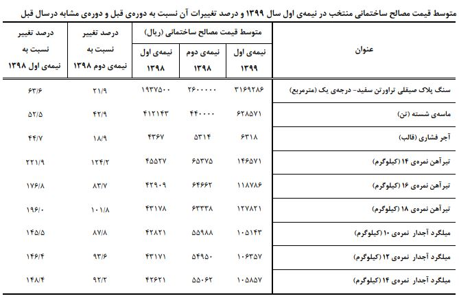 مقایسهی متوسط قیمت تمامی ١٧٩ قلم مورد آمارگیری این دوره نسبت به دورهی قبل، نشان میدهد که «تیرآهن نمره ٣٠» با ١٩٨،٦ درصد دارای بیشترین افزایش و «لمبهی چوبی» با ٦،٥درصد دارای بیشترین کاهش بودهاند.