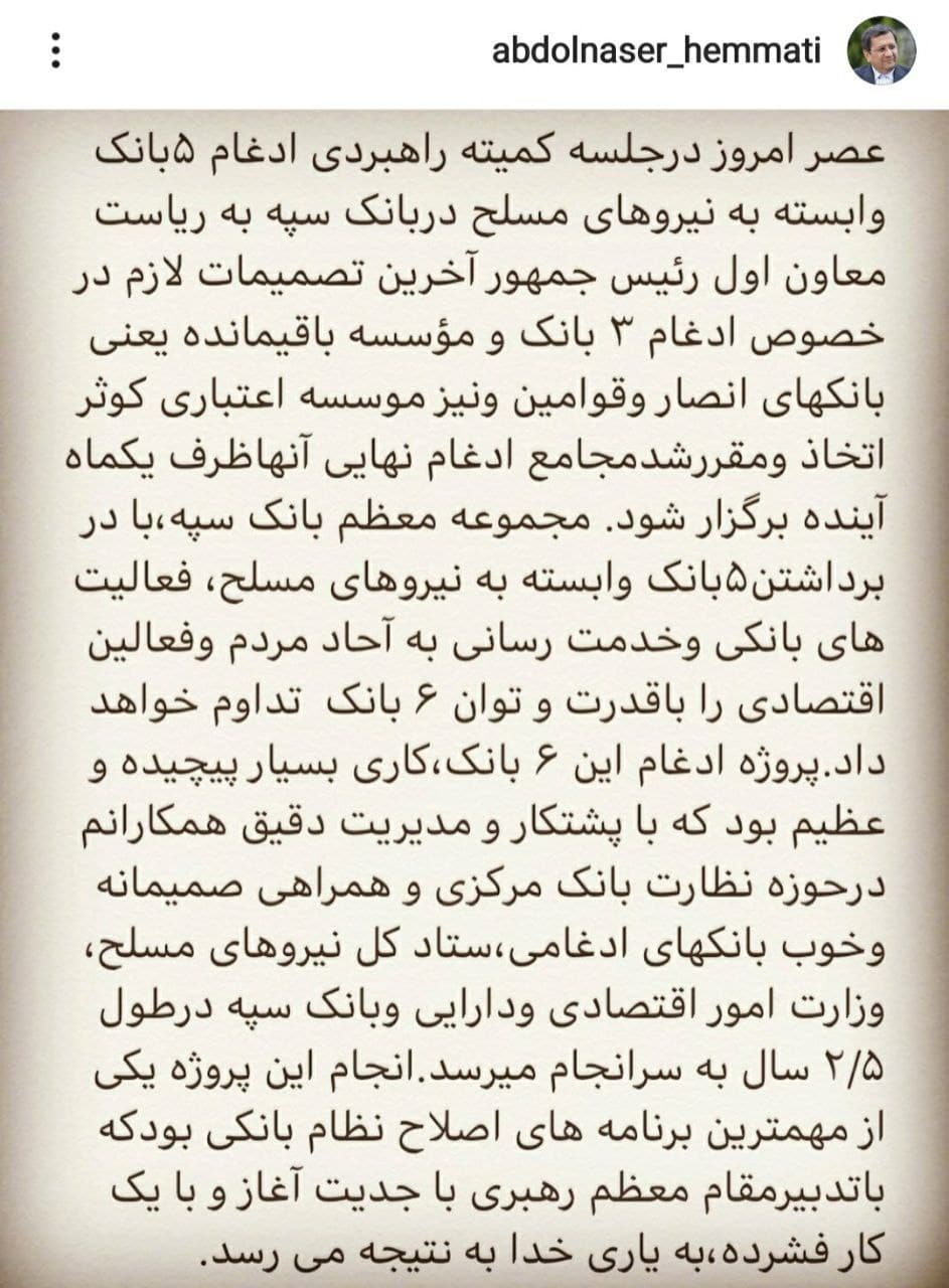 عبدالناصر همتی رئیس کل بانک مرکزی در یادداشتی در اینستاگرام تاکید کرد که پروژه ادغام ۵ بانک وابسته به نیروهای مسلح در بانک سپه یکی از مهمترین برنامههای اصلاح نظام بانکی بود که باتدبیر مقام معظم رهبری با جدیت آغاز و با یک کار فشرده، به یاری خدا به نتیجه میرسد.