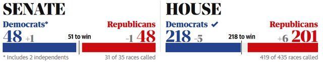 براساس گزارش روز سهشنبه آسوشیتدپرس، دموکراتها تاکنون با کسب ۲۱۸ کرسی به اکثریت در مجلس نمایندگان آمریکا رسیدهاند، اما نسبت به انتخابات گذشته، عملکرد ضعیفتری از خودشان به نمایش گذاشتهاند. جمهوریخواهان هم تاکنون به ۲۰۱ کرسی دست یافتهاند.