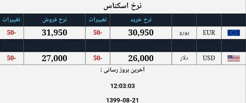 همچنین هر فرانک سوئیس ۴۵ هزار و ۹۳۵ ریال، کرون سوئد ۴ هزار و ۸۸۱ ریال، کرون نروژ ۴ هزار و ۶۷۶ ریال، کرون دانمارک ۶ هزار و ۶۷۳ ریال، روپیه هند ۵۶۷ ریال، درهم امارات متحده عربی ۱۱ هزار و ۴۳۷ ریال، دینار کویت ۱۳۷ هزار و ۱۸۳ ریال، یکصد روپیه پاکستان ۲۶ هزار و ۴۳۰ ریال، یکصد ین ژاپن ۳۹ هزار و ۹۶۳ ریال، دلار هنگ‌ کنگ ۵ هزار و ۴۱۷ ریال، ریال عمان ۱۰۹ هزار و ۲۳۴ ریال و دلار کانادا ۳۲ هزار و ۲۵۴ ریال قیمت خورد.