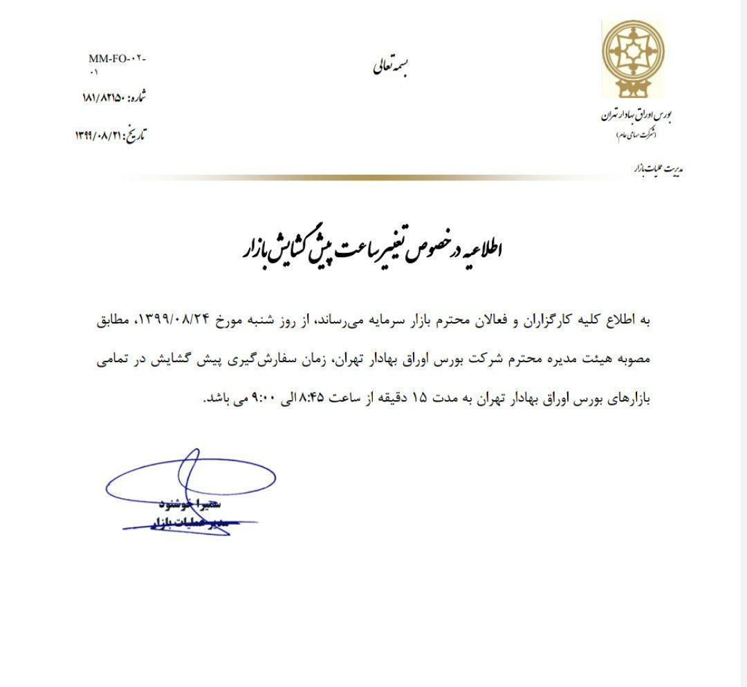 به اطلاع کلیه کارگزاران و فعالان محترم بازار سرمایه میرساند، از روز شنبه مورخ 1399/08/24،مطابق مصوبه هیاتمدیره محترم شرکت بورس اوراق بهادار تهران، زمان سفارشگیری پیشگشایش در تمامی بازارهای بورس اوراق بهادار تهران به مدت 15 دقیقه از ساعت 8:45 الی 9:00 میباشد.