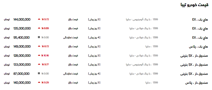 قیمت پراید ۱۵۱ برابر با ۱۲۳ میلیون تومان گزارش شده است. تیبا هاچ بک نرخی برابر با ۱۴۲ تا ۱۴۴ میلیون تومان و تیبا صندوق دار نرخی در حدود ۱۳۳ میلیون تومان دارد. قیمت ساینا در فایل‌ها ۱۴۰ میلیون و ساینا ای‌ایکس دنده‌ای نیز ۱۳۷ میلیون تومان گزارش شد. قیمت کوییک دنده‌ای با رینگ آلومینیومی ۱۴۸ میلیون تومان و قیمت کوییک دنده‌ای رینگ فولادی نیز برابر با ۱۴۳ میلیون تومان گزارش شده است. کوییک آر دنده‌ای نیز ۱۵۸ میلیون تومان قیمت خورده است.