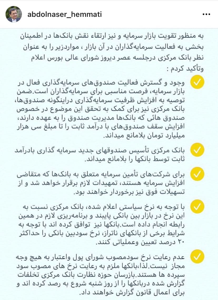 به گزارش سایت طلا،«عبدالناصر همتی» امروز (سهشنبه) در یادداشتی در صفحه اینستاگرام خود نوشت: به منظور تقویت بازار سرمایه و نیز ارتقاء نقش بانک ها در اطمینان بخشی به فعالیت سرمایه گذاران در آن بازار، مواردی را به عنوان نظر بانک مرکزی در جلسه عصر دیروز شورای عالی بورس اعلام و تاکید کردم.