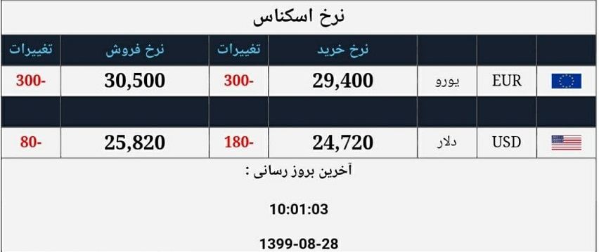 نرخ ارز در صرافی‌ ملی امروز چهارشنبه اعلام شد که بر این اساس قیمت دلار و یورو نسبت به دیروز کاهش یافت و بهای دلار پس از افت ۸۰ تومانی به رقم ۲۵ هزار و ۸۲۰ تومان رسید.بانک مرکزی نیز نرخ رسمی ۴۷ ارز را برای امروز اعلام کرد که بر اساس آن، نرخ ۲۰ ارز کاهش و ۱۵ ارز افزایش یافت. نرخ ۱۲ ارز نیز ثابت ماند.