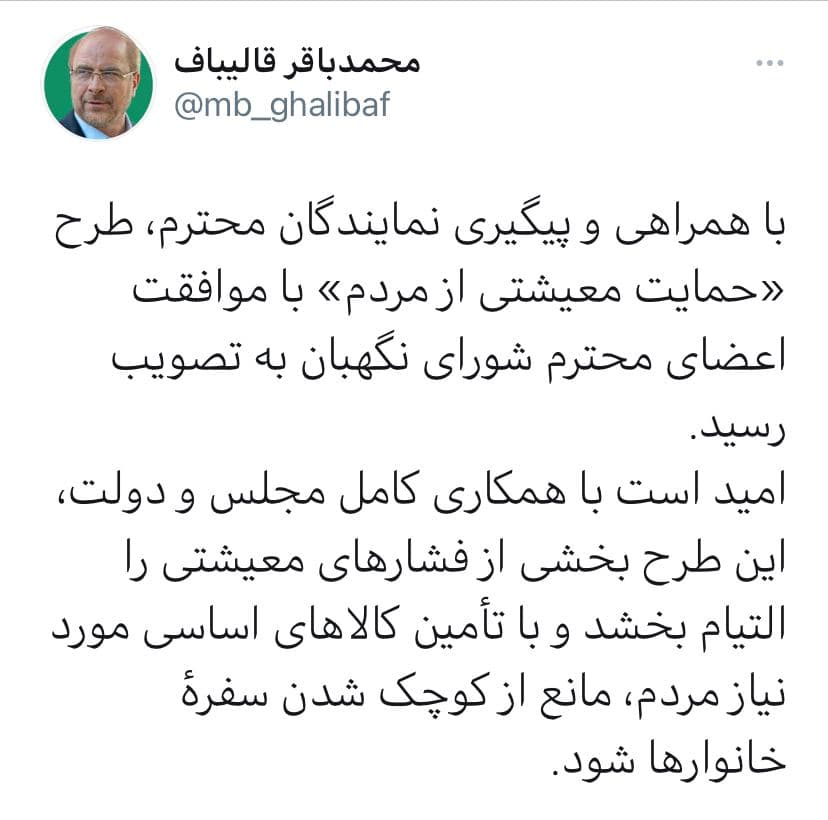 شورای نگهبان مصوبه مجلس برای الزام دولت به پرداخت یارانه کالاهای اساسی را تأیید کرد/توییت رییس مجلس پس از الزام دولت به پرداخت یارانه کالاهای اساسی