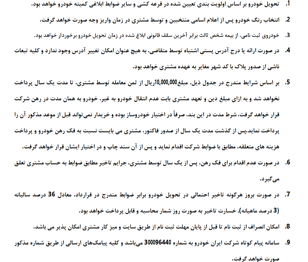 متقاضی باید ظرف ۵ روز پس از اعلام انتخاب شدگان و دریافت پیامک، وجه خودرو را از طریق سایت ایران خودرو واریز کند در غیر این صورت ثبت نام کان لم یکن تلقی خواهد شد.