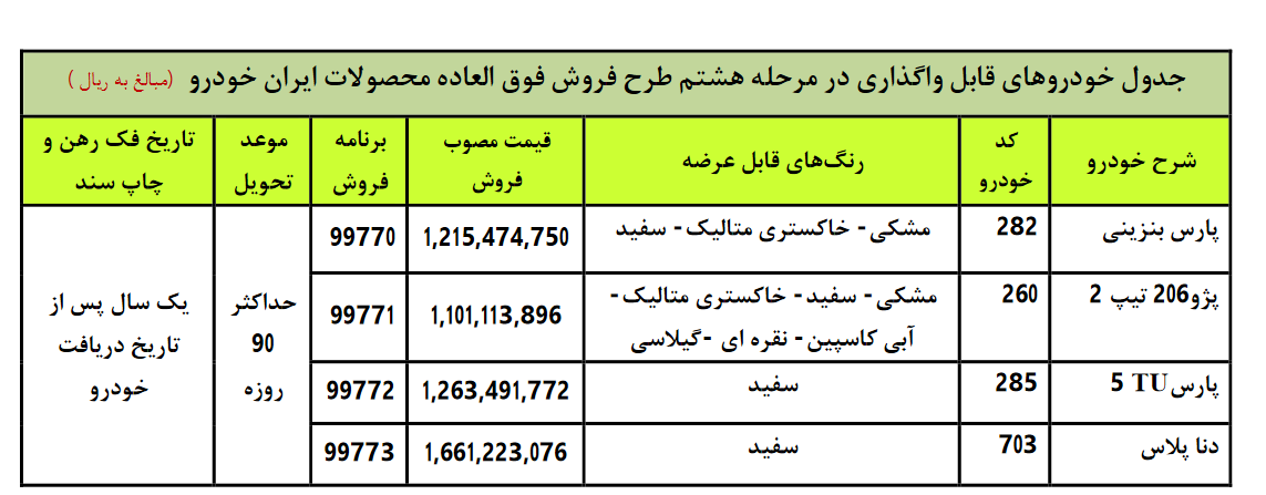 در این طرح فروش فوق‌العاده ایران خودروها با قیمت قطعی زیر عرضه می‌شوند: