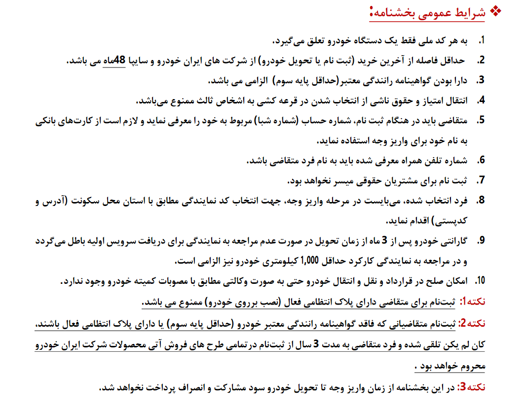 به منظور دستیابی مشتریان واقعی به خودرو، تمامی محدودیت‌های فروش همانند دوره‌های پیشین اجرا می‌شود. متقاضیان می‌توانند برای اطلاع از جزییات این محدودیت‌ها، به بخشنامه این طرح که در سایت فروش اینترنتی محصولات ایران‌خودرو به نشانی esale.ikco.ir قرار دارد، مراجعه کنند. سند خودرو‌ها به مدت یک سال در رهن ایران‌خودرو خواهد بود و برگه اسناد پس از تسویه مشتریان، چاپ و در اختیار آنان قرار خواهد گرفت.