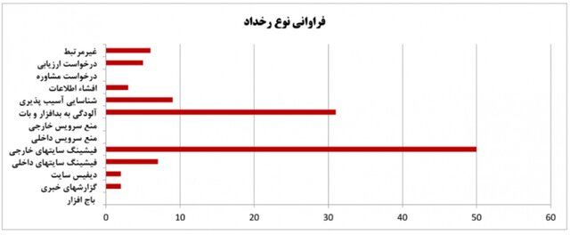 طبق این اطلاعات، بیشترین فراوانی رخداد به ترتیب مربوط به فیشینگ سایتهای خارجی، آلودگی به بدافزار و بات، شناسایی آسیبپذیری، فیشینگ سایتهای داخلی، درخواست ارزیابی، افشای اطلاعات، دیفیس سایت و گزارشهای خبری بوده است.